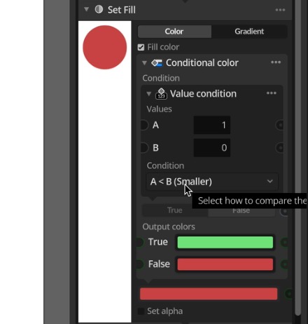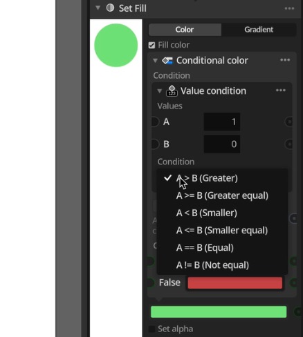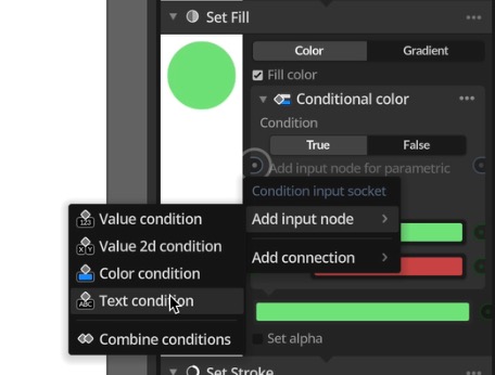 Basic parameter types such as values, colors, sizes and text strings all have conditional input nodes you can add to set their value based on a condition. For example the Conditional color input nodes added to the fill color parameter below.