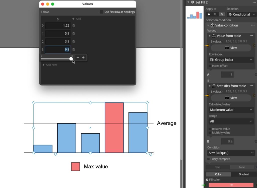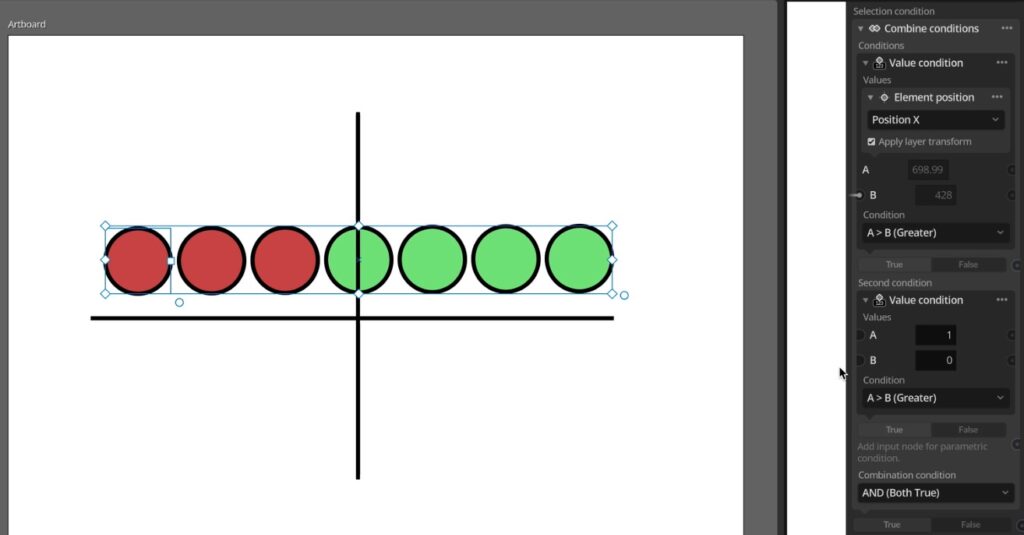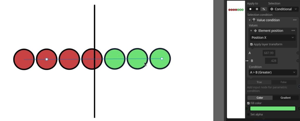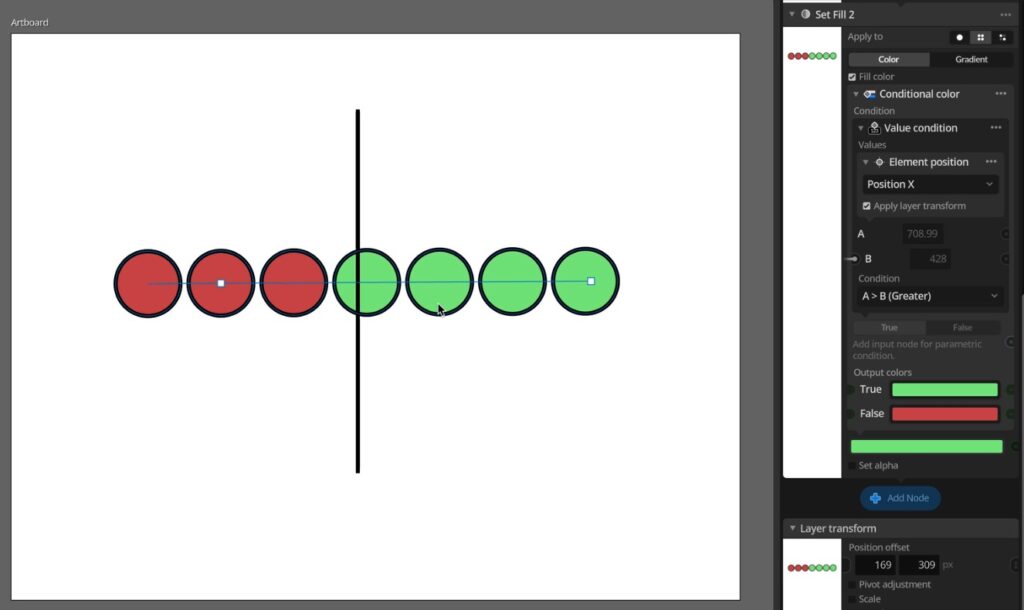 For example you can use the Element position value input node to get the position of each element processed by a Change or Group node (like Set Fill), and this way set up a condition that will be evaluated as true or false based on the position of each element. And you can connect the other value to another layers’ position offset to get a result like the example below.