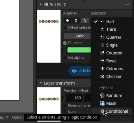 Another way of using the new conditional features is via the Conditional Apply to selection mode. All Change and Group nodes (in other words all nodes that change existing element, rather than create new ones) have an Apply To setting at the top controlling what the change will be applied to. In the Selection Apply to mode you can now also pick Conditional to make a conditional selection.