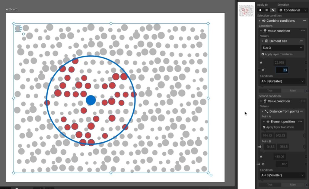 Here’s a slightly more complex example of such a combined condition, where a color change is applied only to circles that are above a specified size limit and closer than a set distance to a target point.