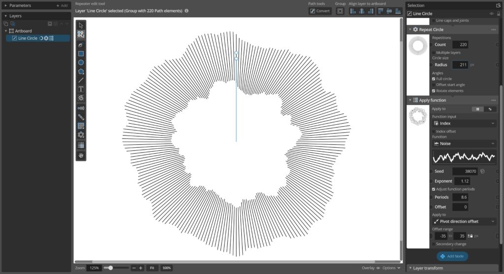 This update adds new ways of transforming elements in groups relative to the group pivot point, either moving them towards/away from the pivot or rotating them around it. These new transforms can be used via the new Group Pivot relative transform node, or as an option in the Apply Function, Randomize etc. nodes.